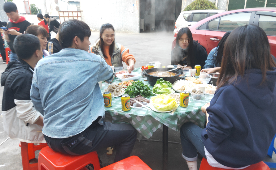 游戲做完,就到了大家最期待的大餐了。在院子里支起幾張桌子,是不是有種吃席的感覺了呢?我們的食堂大師傅早已準(zhǔn)備好了食物,大家一人端幾個(gè),很快就擺滿了桌子。