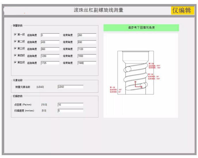 支持絲杠、螺母測量;支持左旋、右旋;能夠實現(xiàn)階段性掃描,由于螺母外圓柱上有安裝孔,所以掃描滾道時需要設置斷點,避開空位掃描測量;